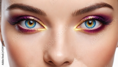 Fototapeta premium A close-up of a woman's eyes showing bright, colorful makeup with shades of purple and blue. A piercing look.