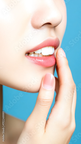 © F-STUDIO, Obraz premium A close-up of a woman's face highlighting her lips and hand against a soft blue background, emphasizing beauty and skincare.
