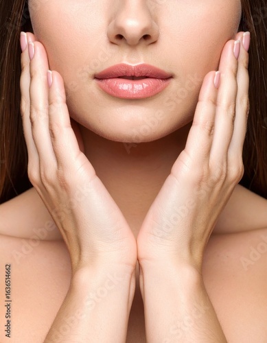 Fototapeta premium A close-up of a woman's face with her hands gently cupping her cheeks, showcasing smooth skin and soft features.