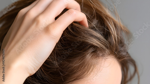 Fototapeta premium A close-up of a woman's hand running through her tousled hair, capturing a...