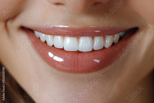 Fototapeta premium A close-up of a woman's joyful smile revealing her bright white teeth in a...