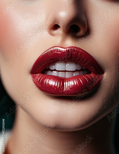 © Julija, Obraz premium A close-up of a woman's lips, featuring shimmering burgundy maroon lipstick, touch of sparkle. The lips are slightly parted, revealing a glimpse of white teeth. Sensuality and sexuality. AI generated