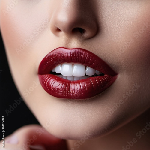 © Julija, Obraz premium A close-up of a woman's lips, featuring shimmering burgundy maroon lipstick, touch of sparkle. The lips are slightly parted, revealing a glimpse of white teeth. Sensuality and sexuality. AI generated