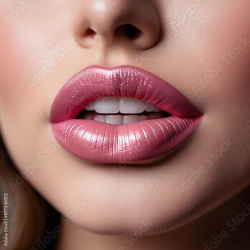 © Julija, Fototapeta premium A close-up of a woman's lips, featuring shimmering pink lipstick that adds a touch of sparkle. The lips are slightly parted, revealing a glimpse of white teeth. Sensuality and sexuality. AI generated