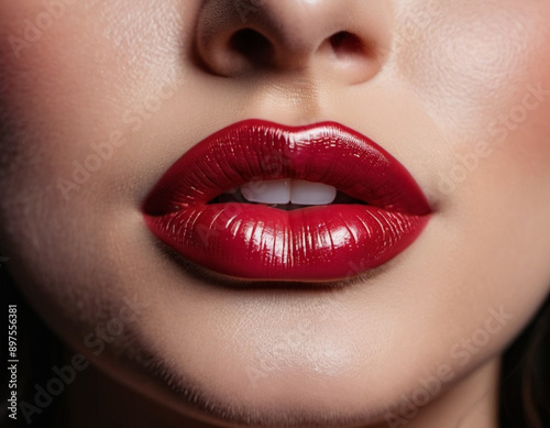 Obraz premium A close-up of a woman's lips, featuring shimmering red lipstick that adds a...