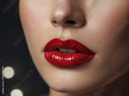 Obraz premium A close-up of a woman’s lips with deep red lipstick, highlighting their fullness and shine, creating a captivating and glamorous look