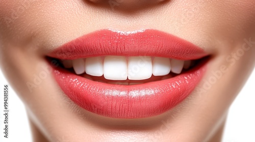 © Lazylizard, Obraz premium A close-up of a woman's mouth displays a beautiful smile with a pinkish tint, set against a pristine white background that enhances the vibrant colors and details