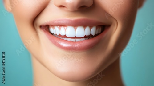 © Dinara, Fototapeta premium A close-up of a woman's smile, showcasing her perfect white teeth and healthy gums.