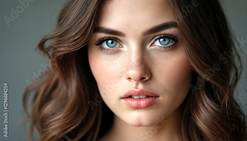© KarpenArt Studio, Obraz premium A close-up of a woman with blue eyes and wavy brown hair.
