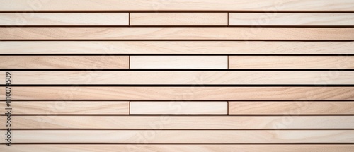 © pattaphorn, Fototapeta premium A close-up of a wooden panel featuring neatly arranged, light-colored planks with subtle variations in texture and color.