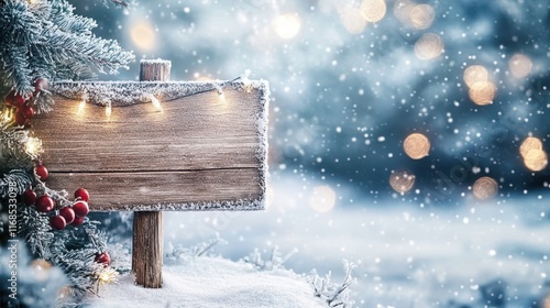 © Sarawut, Naklejka premium A close-up of a wooden sign frosted with snow, surrounded by a dreamy winter scene of falling snowflakes and festive holiday cheer. --ar 16:9 --v 6.1 Job ID: 9e5e19dd-b72c-4af4-b714-b93c6317fa74