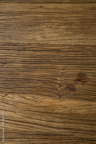 © Phototora, Naklejka premium A close-up of a wooden surface with rich brown tones and natural grain patterns. Darker stains add character and suggest aging or usage.