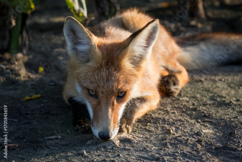 Fototapeta premium A close-up of a young, cute fox lying on the ground and looking toward the...