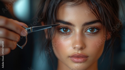 Obraz premium A close-up of a young woman having her eyebrows shaped with scissors.
