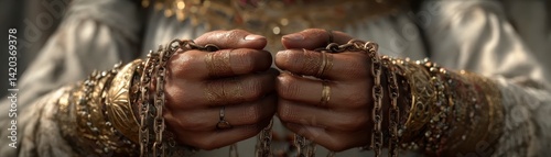 Fototapeta premium A close-up of adorned hands holding chains, showcasing intricate jewelry and a sense of cultural significance.