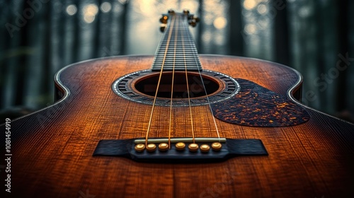 © AGUNG, Obraz premium A close-up of an acoustic guitar in a forest setting.