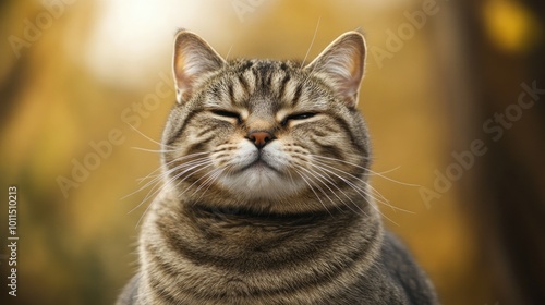 © sujitea, Naklejka premium A close-up of an adorably fat cat with a mischievous expression, its round cheeks and small nose adding to its playful and charming appearance.