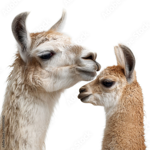 © PNGify, Obraz premium A close-up of an adult llama and its playful baby, showcasing their fluffy coats and gentle expressions.