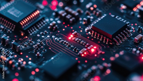 © Aliakbar, Fototapeta premium A close-up of an advanced microchip, showcasing a colorful circuit board with glowing red and blue components.