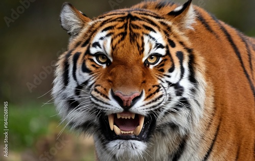 © Oualid, Naklejka premium A close-up of an angry tiger face looking at the camera