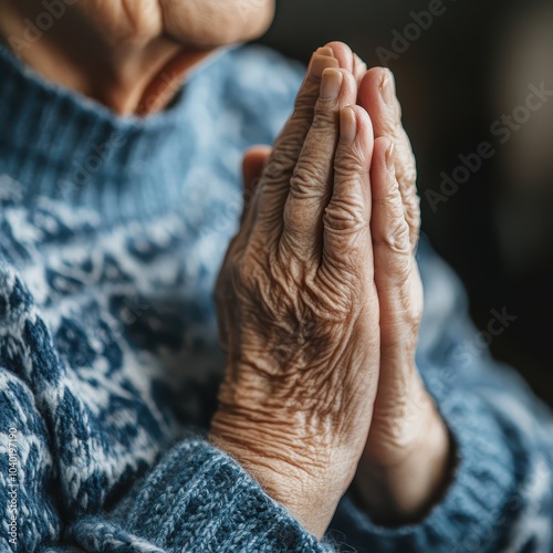 Fototapeta premium A close-up of an elderly person with hands clasped in prayer, participating...