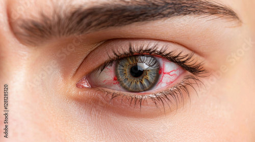 © Wonderful Studio, Obraz premium A close-up of an eye displaying intricate details, including a mix of green and grey hues, with prominent eyelashes and slight redness around the iris.
