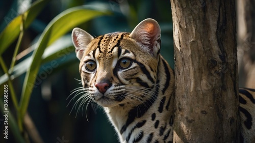 Obraz premium A close-up of an ocelot peering from behind a tree, showcasing its striking...