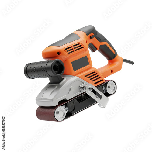© MrIdhA, Fototapeta premium A close up of an orange and silver belt sander tool