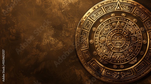 © Dexter, Naklejka premium A close-up of an ornate Aztec calendar, its intricate details and rich golden hue creating a sense of mystery and ancient wisdom.