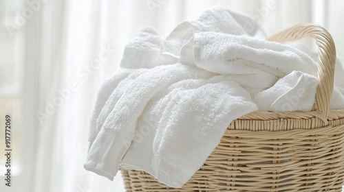 Obraz premium A close-up of an overflowing laundry basket filled with white towels and linens, set against a bright, clean background.