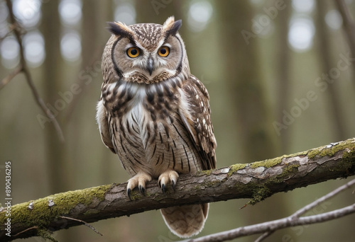 Obraz premium A close-up of an owl perched on a branch, with its head swiveling to listen...