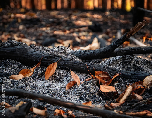 © Vitali, Fototapeta premium A close-up of ash and burnt leaves on the forest floor, a somber reminder of the recent fire's impact.