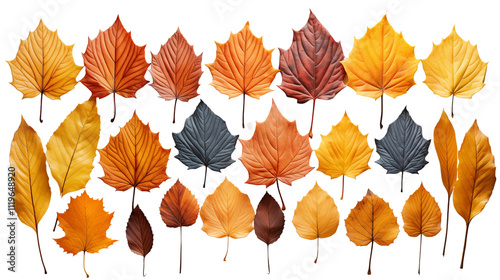 Obraz premium A close-up of autumn leaves glowing under sunlight, displaying their intricate patterns and hues, isolated on transparent background.