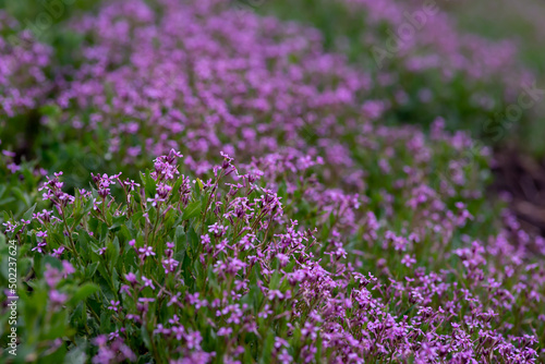 Fototapeta premium A close up of Chorispora tenella, or purple mustard, an Asian invasive species. A field of purple flowers. Purple and pink flowers with green stems on mustard weed. sunrise early morning