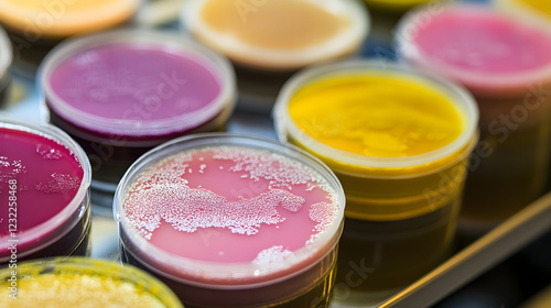 © Kanomaoi, Naklejka premium A close-up of colorful petri dishes with various bacterial colonies growing on different media, used in microbiology research or laboratory experiments