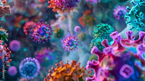 Fototapeta premium A close-up of colorful virus particles, floating in a blue and purple...