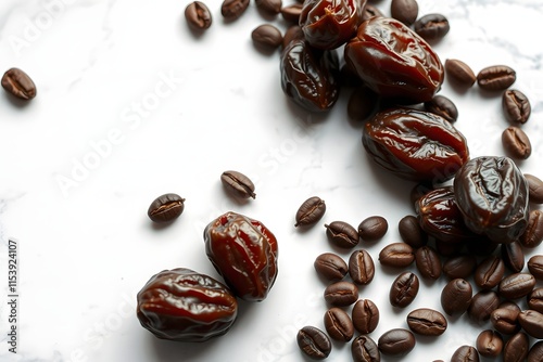 Obraz premium A close-up of dates and coffee beans on a marble surface, suggesting a...