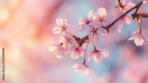 Fototapeta premium A close-up of delicate cherry blossoms blooming on a tree branch against a soft-focus pastel sky, symbolizing spring's arrival and renewal. Gentle sunlight enhances the petals.