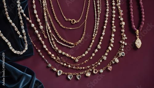 Fototapeta premium A close-up of delicate necklaces and bracelets elegantly displayed on a soft velvet background, showcasing intricate details.