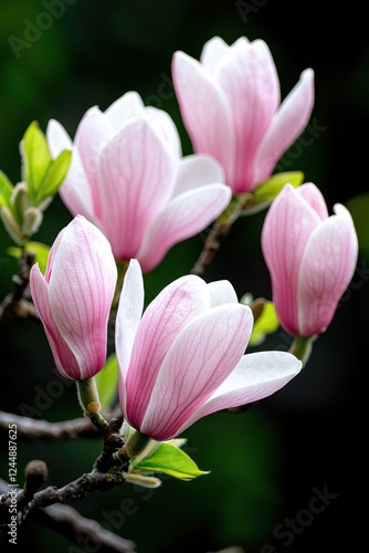 Naklejka premium A close-up of delicate pink magnolia flowers on a branch against a dark...