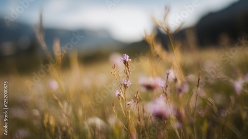© Tom, Fototapeta premium A close-up of delicate purple wildflowers in a serene meadow, surrounded by softly blurred grass and distant mountains under a gentle sky.