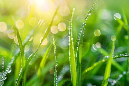 Fototapeta premium A close-up of dewdrops glistening on blades of grass in the morning sun.
