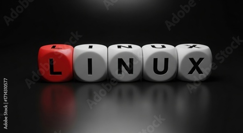 © Rauf, Obraz premium A close up of dice spelling out linux with a red die for the letter l on a black background