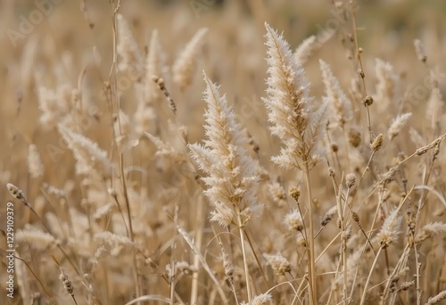 © Anum, Fototapeta premium A close-up of dried sedge with a peach fuzz color, against a beige and abstract background