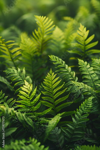 Obraz premium A close up of evergreen fern leaves, a terrestrial plant, in a forest. Ferns are nonvascular land plants that provide groundcover in natural landscapes