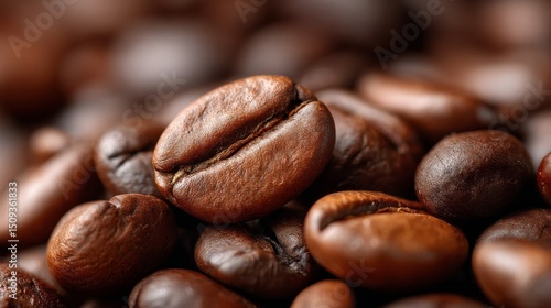 Naklejka premium A close-up of freshly roasted coffee beans reveals deep brown hues and an...