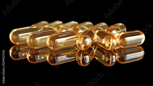 © ARTIFICIAN, Fototapeta premium A close-up of golden Omega-3 soft gel capsules on a reflective surface