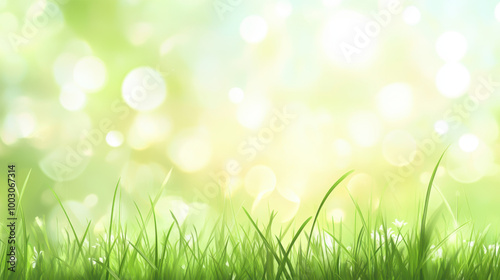 © NKTN, Fototapeta premium A close-up of green grass with a blurred background of bokeh lights
