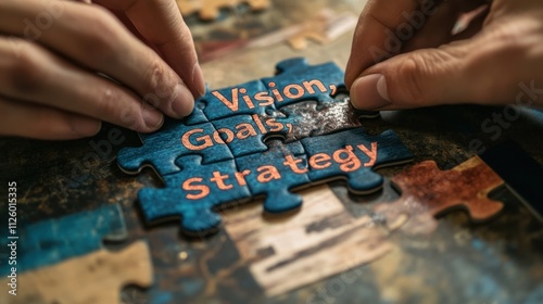 © Napasnan, Obraz premium A close-up of hands arranging puzzle pieces labeled "Vision," "Goals," and "Strategy" on a table, symbolizing strategic planning