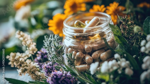 Fototapeta premium A close-up of herbal supplements in clear capsules, representing natural...